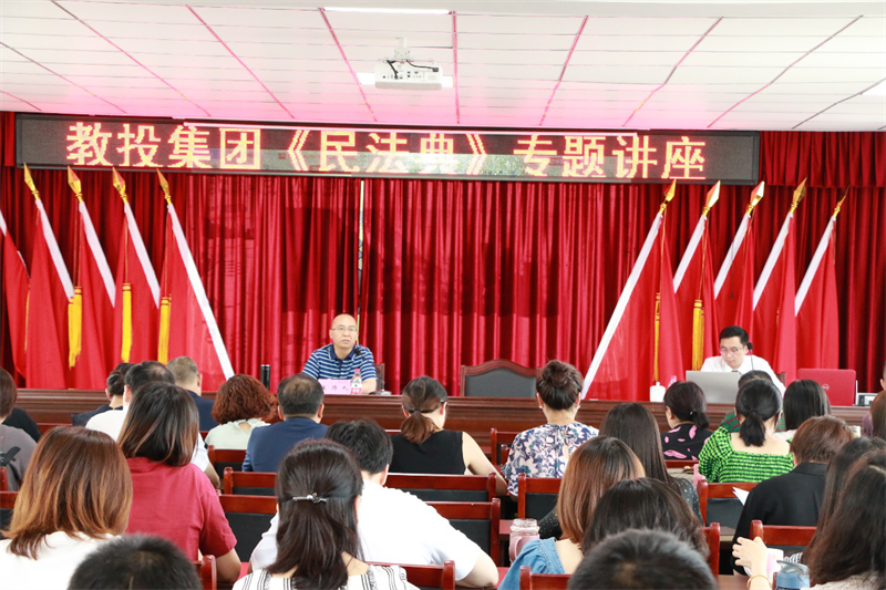 2020年7月15日,教投集团组织举办《中华人民共和国民法典》专题普法讲座。讲座由集团公司副总经理王云航主持,泰和泰律师事务所张镭律师担任主讲,集团公司本部全体干部员工、子公司中层及以上管理人员、三所实验学校人事及法律事务相关人员共计70余人参加讲座。