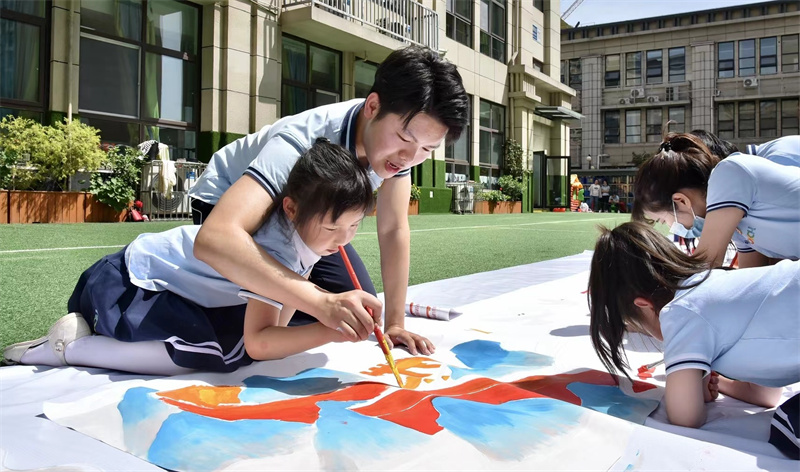 4月29日,川幼春晖青年教师和孩子们在文跃路幼儿园的操场上执笔挥毫,妙绘丹青,绘制了原创长卷“喜迎二十大,永远跟党走,奋进新征程”。