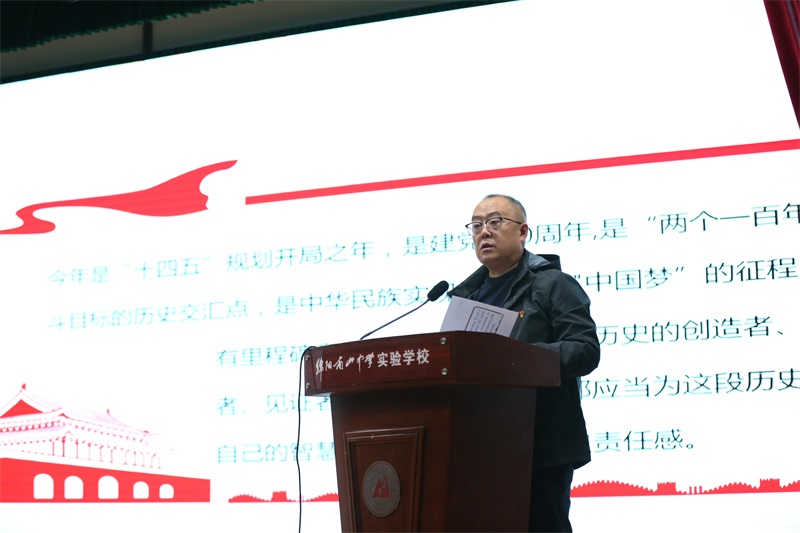 会议在庄严的国歌声中拉开序幕。学校党委书记、校长谭世贵以《爱国 奋斗 奉献》为题为大家讲授了一堂内容丰富的党史党课。谭校长以南开大学老校长张伯苓的爱国三问开场“你是中国人吗”“你爱中国吗”“你愿意中国好吗”,结合历史事件和英雄人物事迹,生动形象,内涵深刻。他要求,要把爱国主义摆在首位,这是实现第二个百年奋斗目标的成功之本;要把不懈奋斗摆在重要位置,这是成功之基;要把牺牲奉献摆在关键位置,这是成功之要。