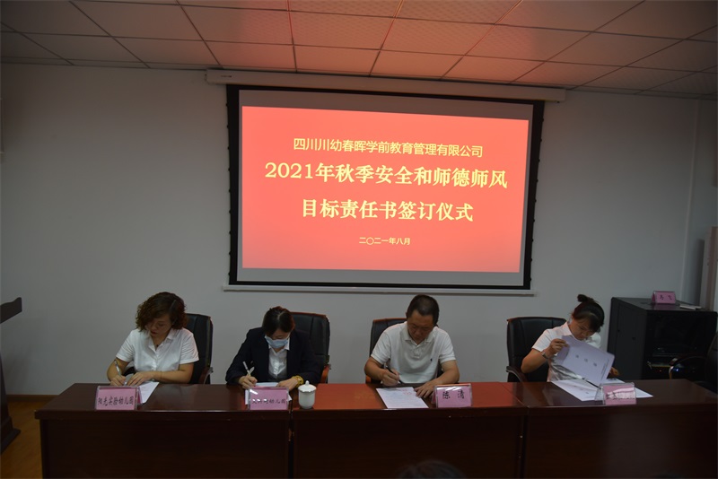 公司管理层与各园负责人签订2021年秋季安全和师德师风目标责任书,坚决做到按规矩办事、按制度办事,时刻绷紧廉洁自律,强化规矩意识,筑牢纪律底线。