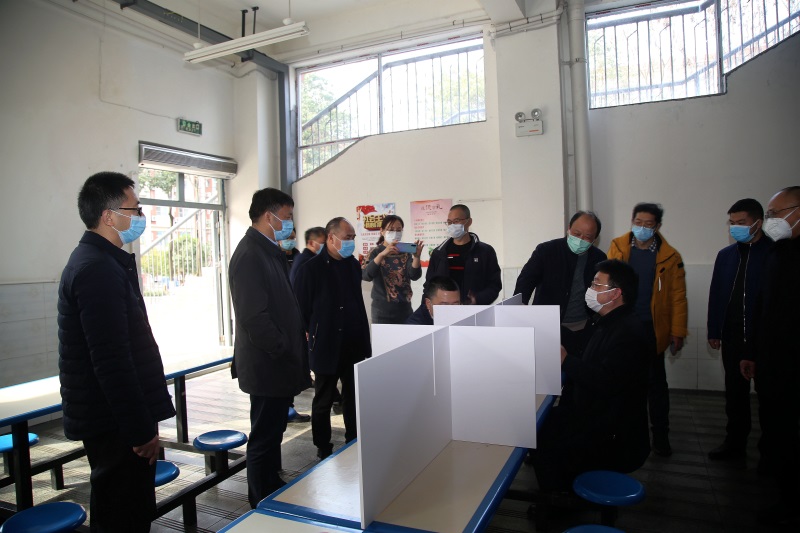 视察组详细查阅学校防疫过程资料 视察组详细查阅学校防疫过程资料 视察组查看学校封闭管理设施 视察组校内现场调研 领导一行视察食堂分隔式餐桌