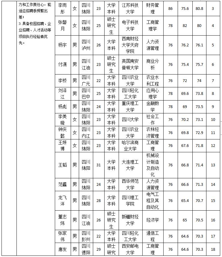 绵阳春晖教育管理有限公司关于招聘保育、保安 岗位测试成绩的公示(第四批)