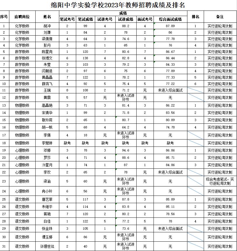 绵阳中学实验学校 2023年教师招聘成绩及排名的公示