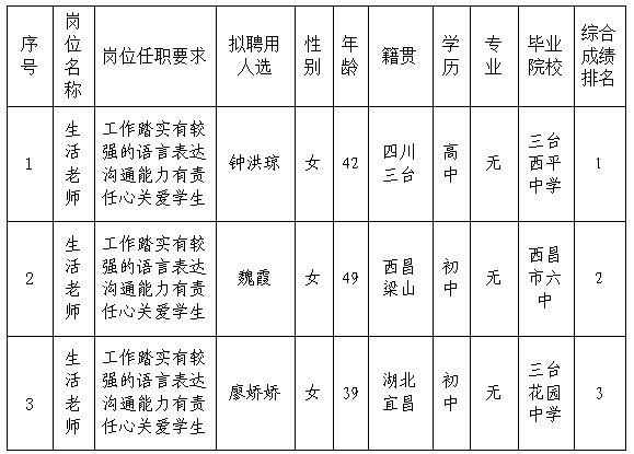 绵阳南山中学实验学校生活老师拟聘用人员结果公示(第二批)