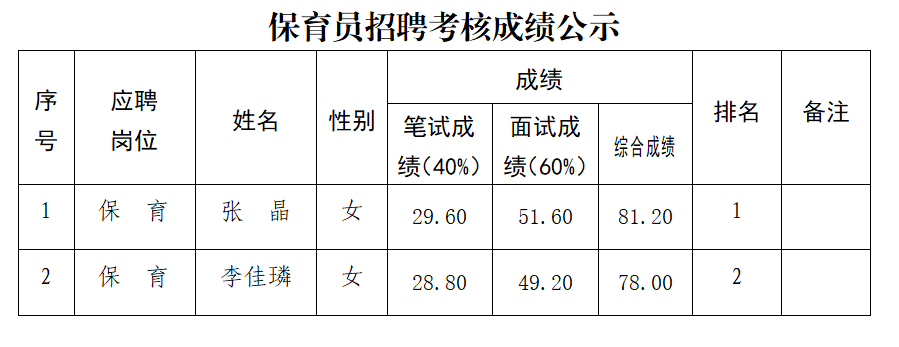 附件:保育员招聘考核成绩及排名