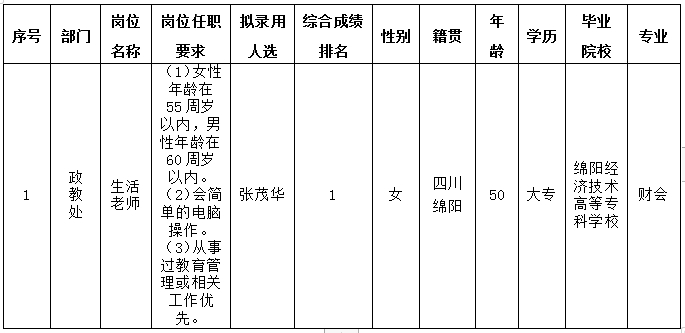 绵阳中学实验学校关于招聘生活老师岗位拟录用人员的公示(第四批)