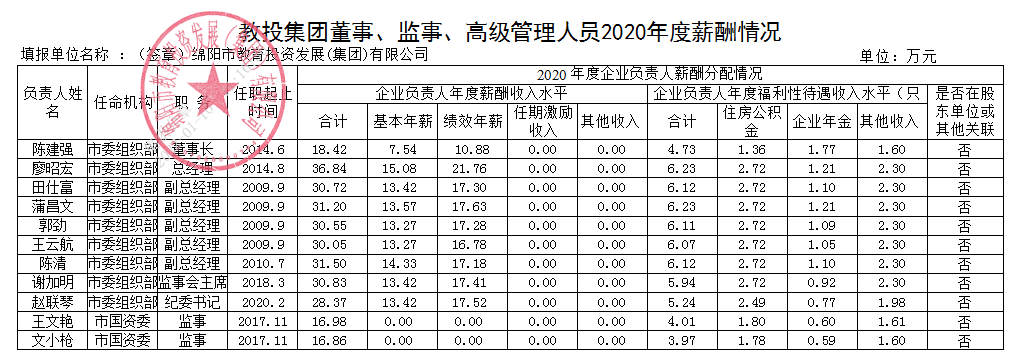教投集团董事、监事、高级管理人员2020年度薪酬情况