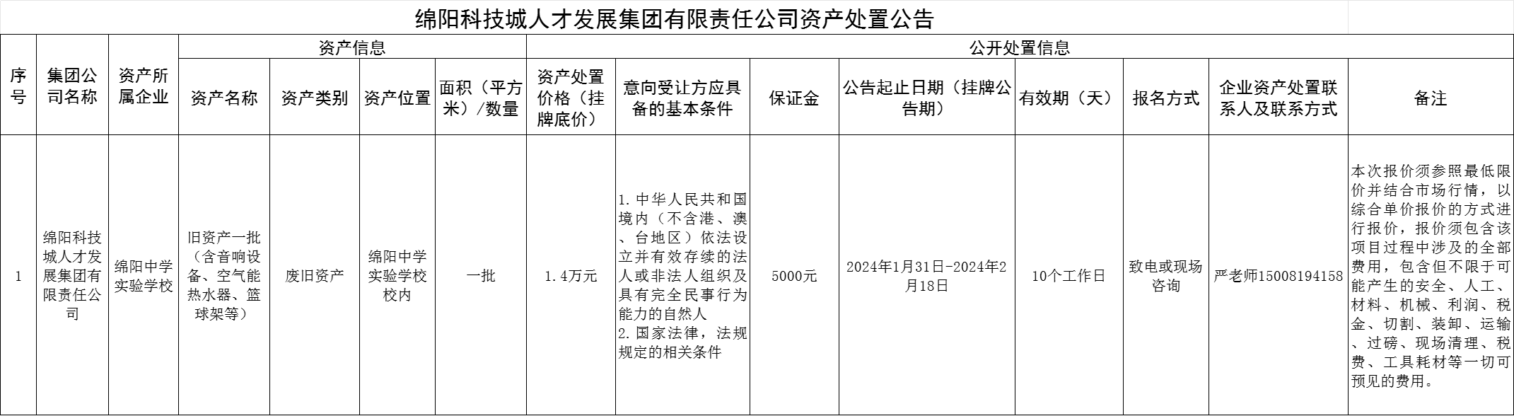 绵阳市市属国有企业资产公开处置信息公示表-人才集团2024....
