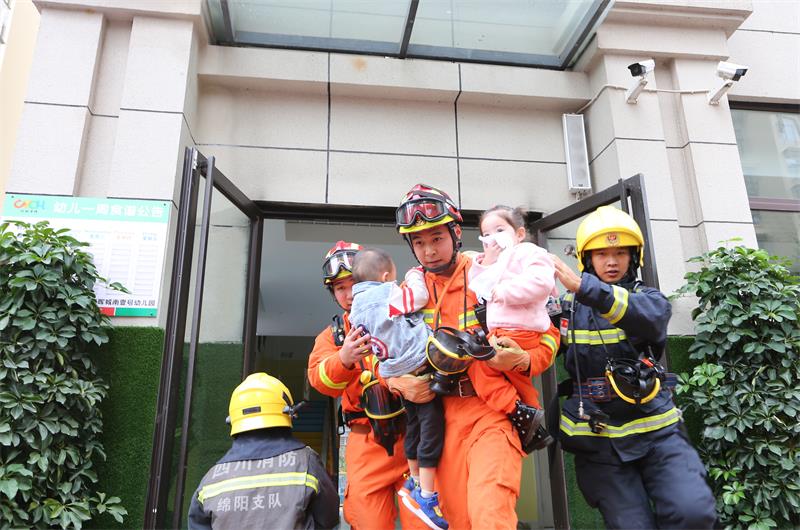 当日15时许,随着一阵烟雾弥漫,火警铃声骤然拉响,消防演练正式开始。幼儿园老师迅速组织幼儿用湿毛巾捂住鼻子和嘴巴,弯着腰从各疏散通道安全撤离到操场。同时,接到“报警”的消防员带领各班老师迅速清点人数,发现有三名学生被困教学楼,两名消防救援人员迅速上楼解救被困小朋友。
