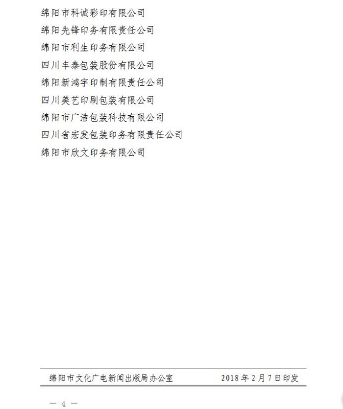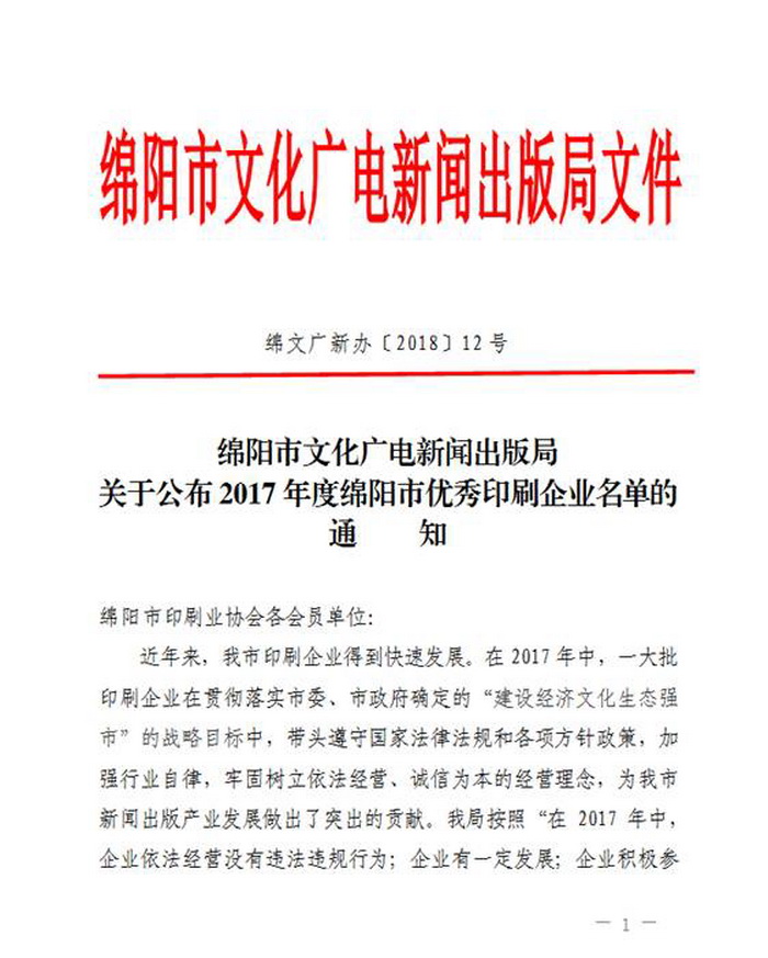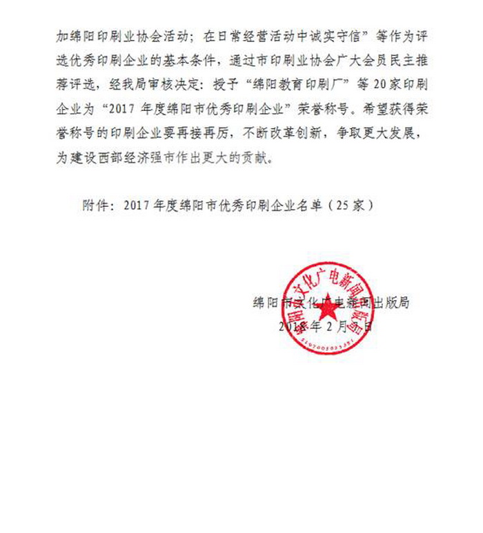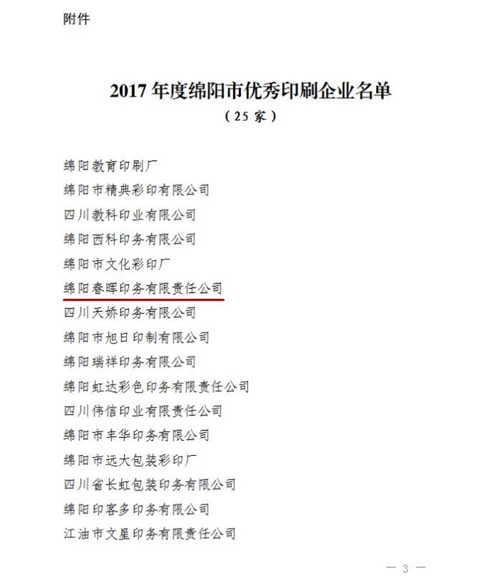 春晖印务公司获评“2017年度绵阳市优秀印刷企业”荣誉称号